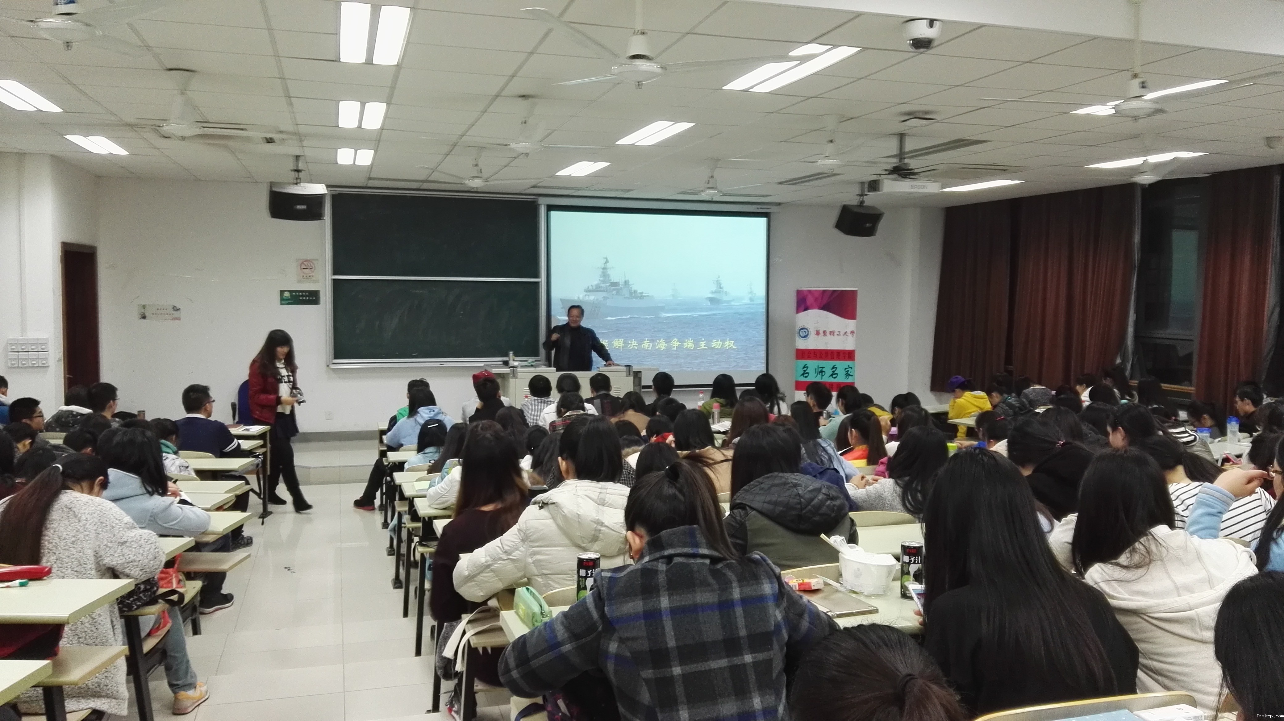 2015年11月30日晚18:30,社会学院名师名家系列讲座第二讲在奉贤校区D304顺利举行。本期主讲嘉宾为马克思主义学院副院长杨苏教授,主题为“中国外交与国防新举措——把握解决南海争端主动权”,讲座由社会学院团委书记王寅申主持,会场座无虚席。