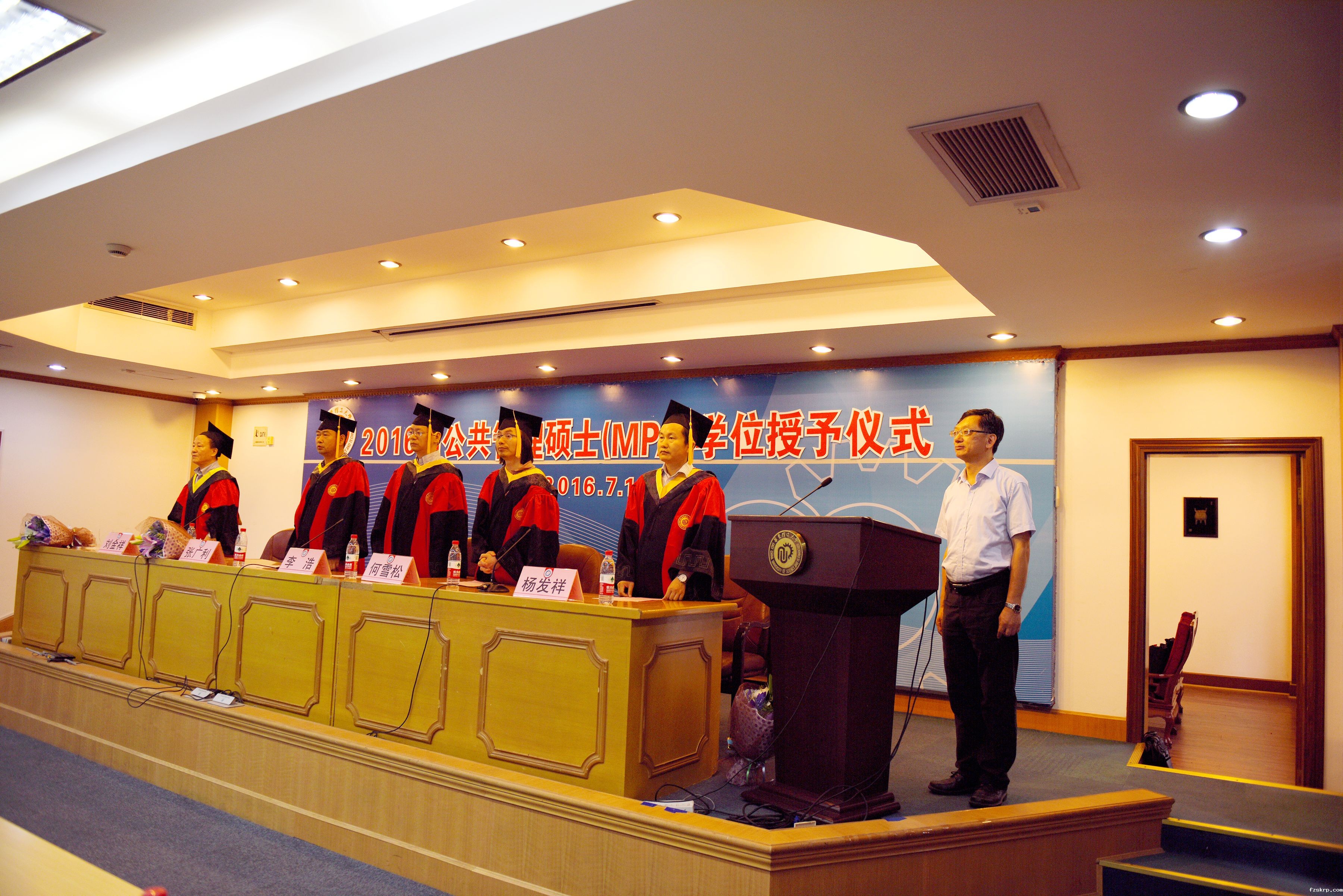 上午九点整,学位授予仪式在庄严肃穆的国歌声中正式开始。 张良主任向出席的学员介绍了出席学位授予仪式的领导和嘉宾。何雪松院长在致词中期望学生能够秉持君子之风,在今后的学习和工作中堂堂正正做人,勤勤勉勉做事。李浩教授宣读了校学位评定委员会的公告,并由五位导师给出席的学生颁发了硕士学位,为学员正冠拨穗。随后学生代表向五位导师敬献了鲜花,以谢培养之恩。