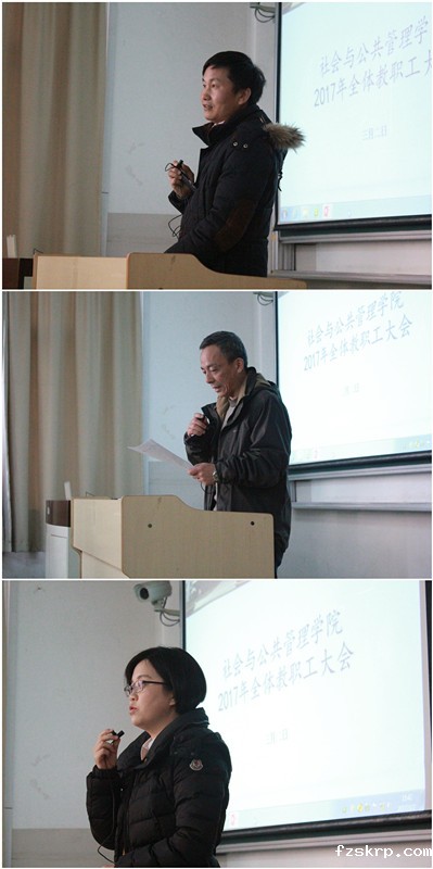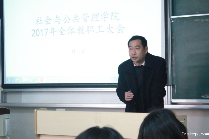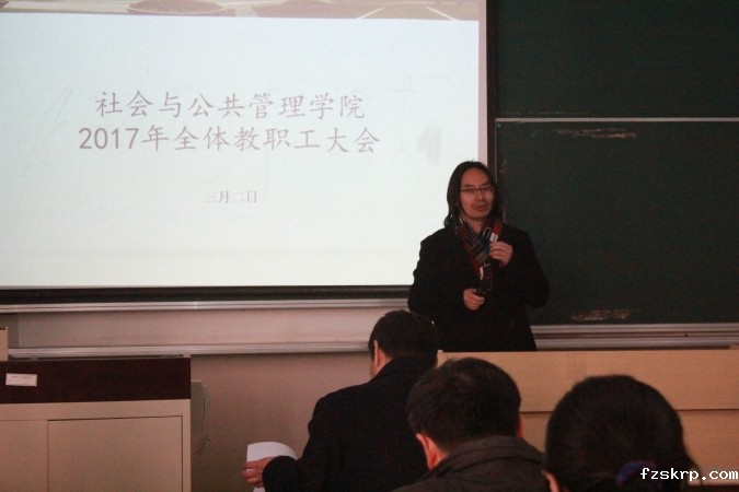 32日下午1500,社会与公共管理学院在四教203隆重举行2017年全院教职工大会。社会学院全体教职工参与,气氛热烈。