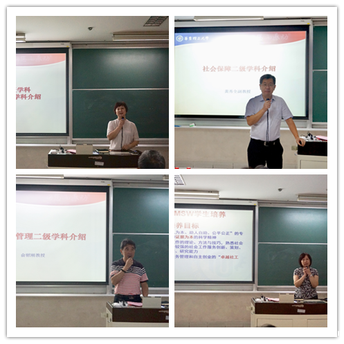 紧接着,各学位点负责导师向新生介绍各一级二级学科发展情况。郭圣莉教授向研究生新生介绍了公共管理一级学科及行政管理二级学科,她希望同学们在华理的求学生活中培养出科学的学术精神和良好的素养。龚秀全副教授详细介绍了社会保障二级学科,他通过向新生们展示鲜活生动的学习案例,激发同学们的学习热情和崇高的理想,并真诚地祝福同学们收获美好的未来。俞慰刚教授向同学们介绍了土地资源管理二级学科,他从选课、生活等生活与学习的细节方面对同学们表示出关心,并对同学们的美好未来充满期待。费梅萍教授就社会工作专业的培养方案、培养目标、实习基地等方面作了细致的讲解,她希望同学们都能拥有国际的视野,华理社会工作专业的同学们都能成为“卓越社工师”。