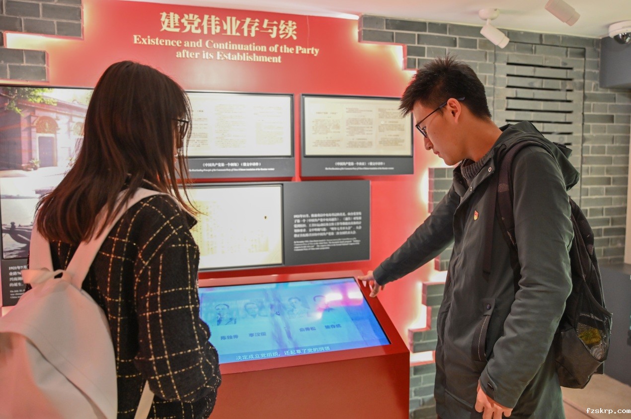 走进序厅,“中国共产党万岁”的字幕和一尊群像雕塑映入眼帘,多媒体展厅开始播放有关中共二大的记录影片,厚重的历史扑面而来,党员和发展对象们纷纷驻足观看,隔着时空触摸感受那段峥嵘的岁月。