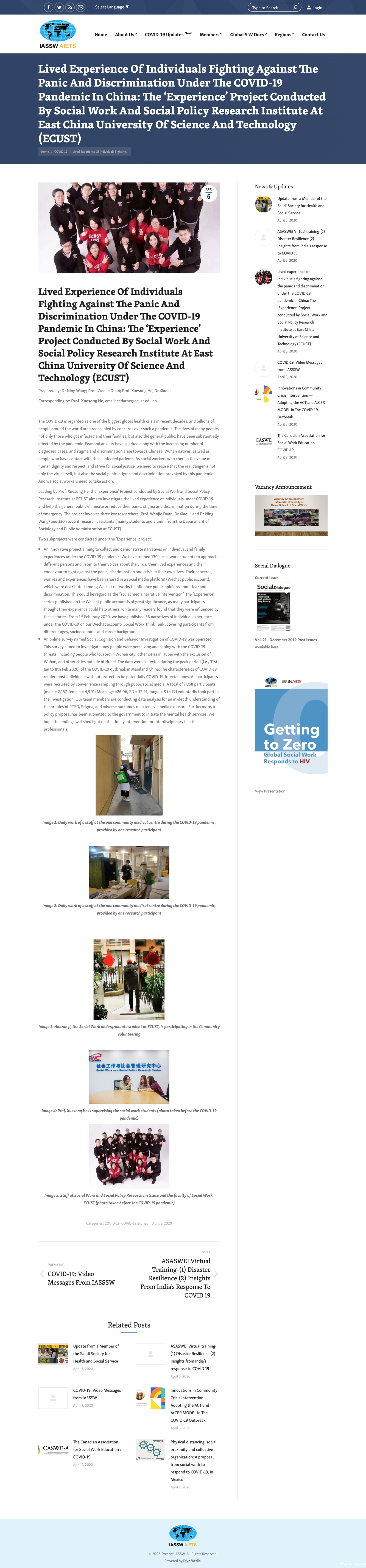 近日,作为联合国咨询机构之一的国际社会工作学院联盟“The International Association Of Schools Of Social Work”(简称IASSW)在新闻网站上报道了由社会与公共管理学院何雪松教授领导的干预计划和科研项目。此次新冠“感受”计划和“社会认知”调查项目由伟德下载官网安装app社会工作及社会政策研究院负责施行,团队成员有段文杰教授、李筱博士、王宁博士以及130名学生研究助理(主要为bet韦德地址的学生和校友)。项目通过调研一线抗疫人员和普通大众在疫情期间的经历和想法,帮助减少公众对康复患者以及接触者的歧视,促进公众形成正确的抗疫观。