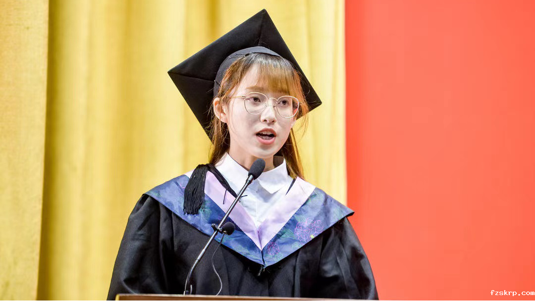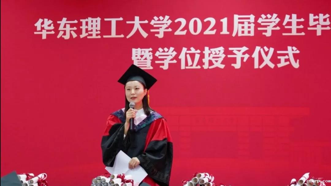主会场典礼议程结束后,学院毕业典礼正式开始。首先,2021届毕业生代表孙洁开上台发言,她回顾了四年华理生活中的点滴记忆,表达了对母校的感激与不舍。