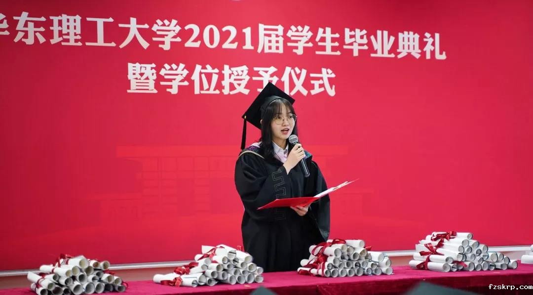 伴随着雄壮的国歌声响起,毕业典礼正式开始。在学校毕业典礼上,社会学院行管171班吕高月作为学校2021届本科毕业生代表,分享了她在大学阶段扎根学校、深入城市、投身乡村的三个故事和三个选择,以此鼓励全体华理学生服务社会,实现人生价值。接下来,研究生代表和校友代表分别送上深情寄语与美好祝福。最后,校长轩福贞在讲话中嘱咐全体华理学子厚植家国情怀,肩负历史使命,让学习成为向上生长的力量,让学习成为一生不渝的坚守,让学习成为青春远航的动力。