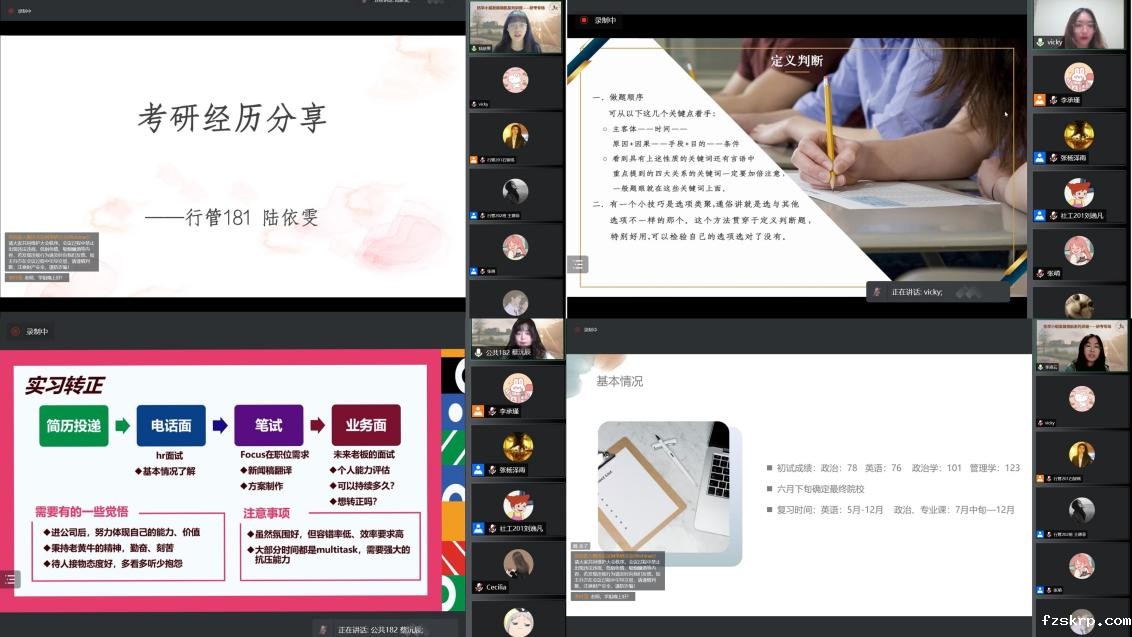据悉,社会与公共学院始终坚持将就业环节前置,引导学生从低年级开始进行自我探索,明确个人发展目标。本次发展领航系列经验分享会克服了疫情带来的重重困难,通过线上分享的方式,邀请优秀高年级同学分享升学、就业成功经验,实现朋辈互助,促进学院人才培养建设。今后,社会与公共管理学院会继续开展简历修改、结构化面试、介绍信撰写等发展领航活动,帮助同学们尽早做好未来发展规划,做好充足准备,助力学院和学校的人才培养。
