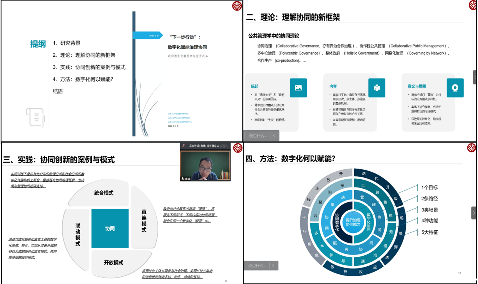 2022年6月8日,伟德下载官网安装app70周年校庆学术活动“智慧政府与数字治理”系列讲座第二讲在线上顺利举行。北京大学政府管理学院副院长黄璜教授作为主讲嘉宾为师生做了题为“数字化协同的理论与实践”的学术讲座。本次讲座由bet韦德地址主办、行政管理系承办,副院长陈丰教授主持。