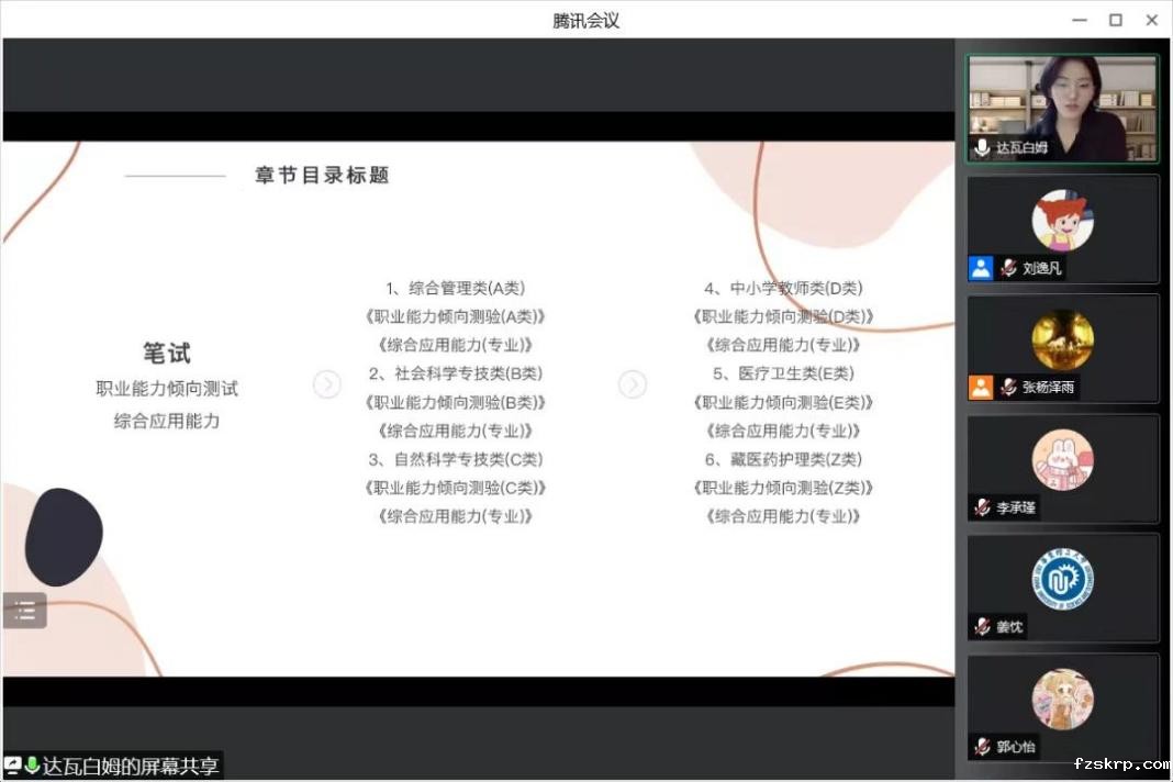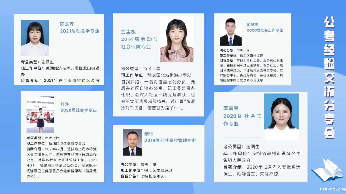 6月11日,来自上海、安徽等地基层公务员岗位的6位校友通过自己的精彩分享,帮助同学们明确考试动向和政策,掌握备考流程和方向。陆伟鼓励应届生树立里程碑、一根轨道、终身学习的三点信念;竺尘极从如何看待公务员职业、如何应对考试不能一次通过情况和成功之后应该保持的状态三个方面分享了自己的体会;付洋重点探讨了报考公务员的目的问题;俞慧杰总结出笔试备考五点建议、面试备战三点经验,建议同学们做好自测、自知和自我规划,保持自信状态;李雪慧着重介绍了各地选调生考试详情;陈思齐分享了在基层工作的经历,并重点分析了安徽省公务员考试的特点。
