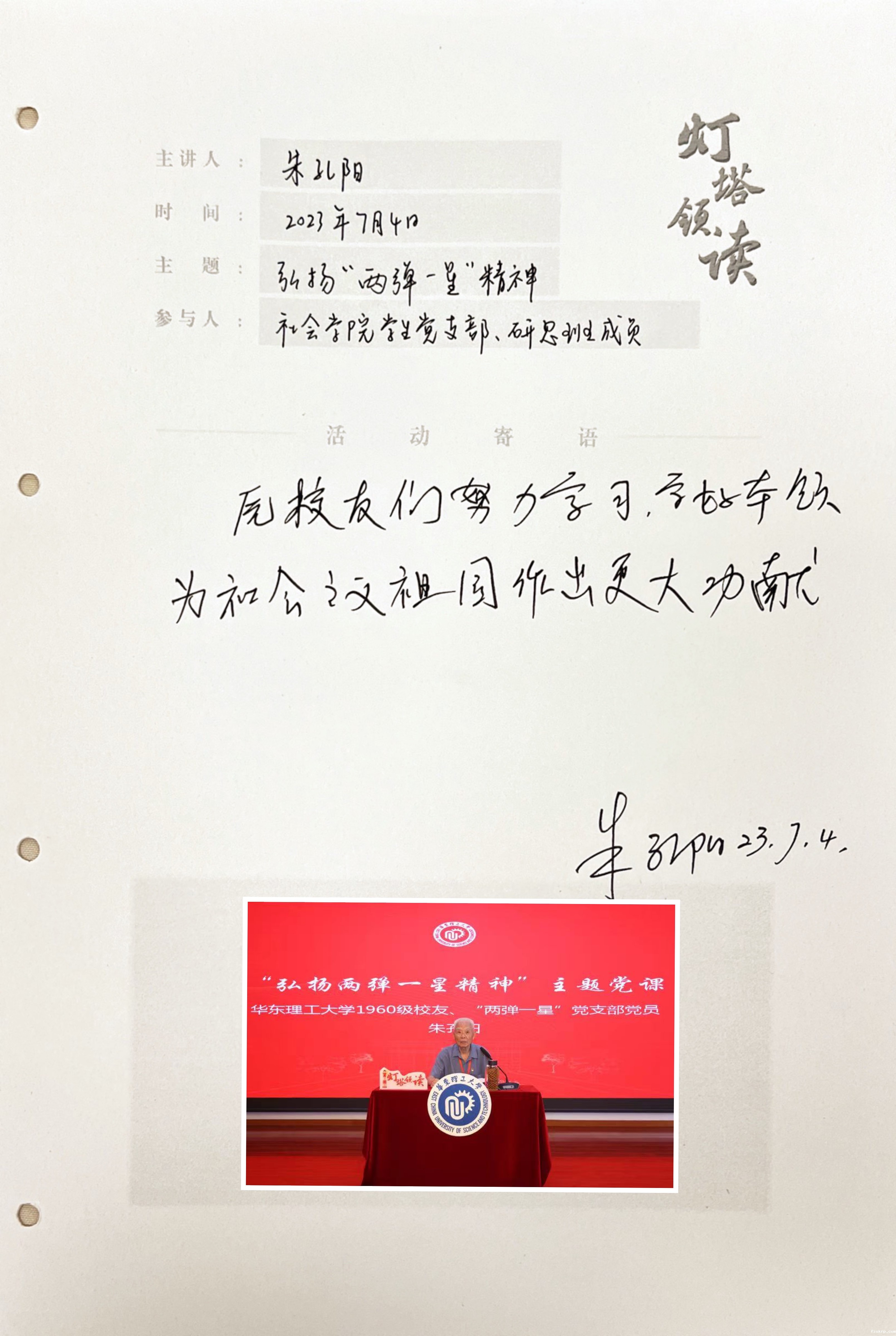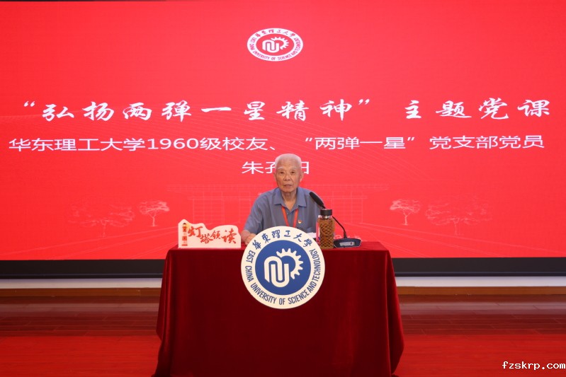 在启动仪式上,同学们首先观看了上钢新村街道“两弹一星”党支部的纪录片《初心》。之后,朱孔阳为同学们上了题为“弘扬‘两弹一星’精神”的沉浸式主题党课。朱孔阳讲述了上世纪五六十年代,他在伟德下载官网安装app的前身华东化工学院第二无机系刻苦求学,毕业之后响应党和国家的号召,远赴青海基地投身军工研发的人生历程。朱孔阳结合自己的亲身经历,向同学们介绍了新中国成立以来,我国“两弹一星”事业从立项到研发,从第一颗原子弹、氢弹的爆炸成功到第三代、第四代核武器的发展历程。他为同学们逐字逐句地解读了以“热爱祖国、无私奉献、自力更生、艰苦奋斗、大力协同、勇于登攀”为内容的“两弹一星”精神的丰富内涵。在党课最后,朱孔阳寄语同学们:“中国式现代化建设要有青年人来接班,年轻人责任重大,要学好本领,才能更好地为社会主义现代化建设服务。”