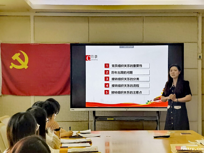 学院组织员张熠为毕业生党员介绍了组织关系转接的相关事项。她从工作原则、具体流程、常见问题及注意事项三个方面进行展开,提醒各位党员为自己的党组织关系转接事宜负责。