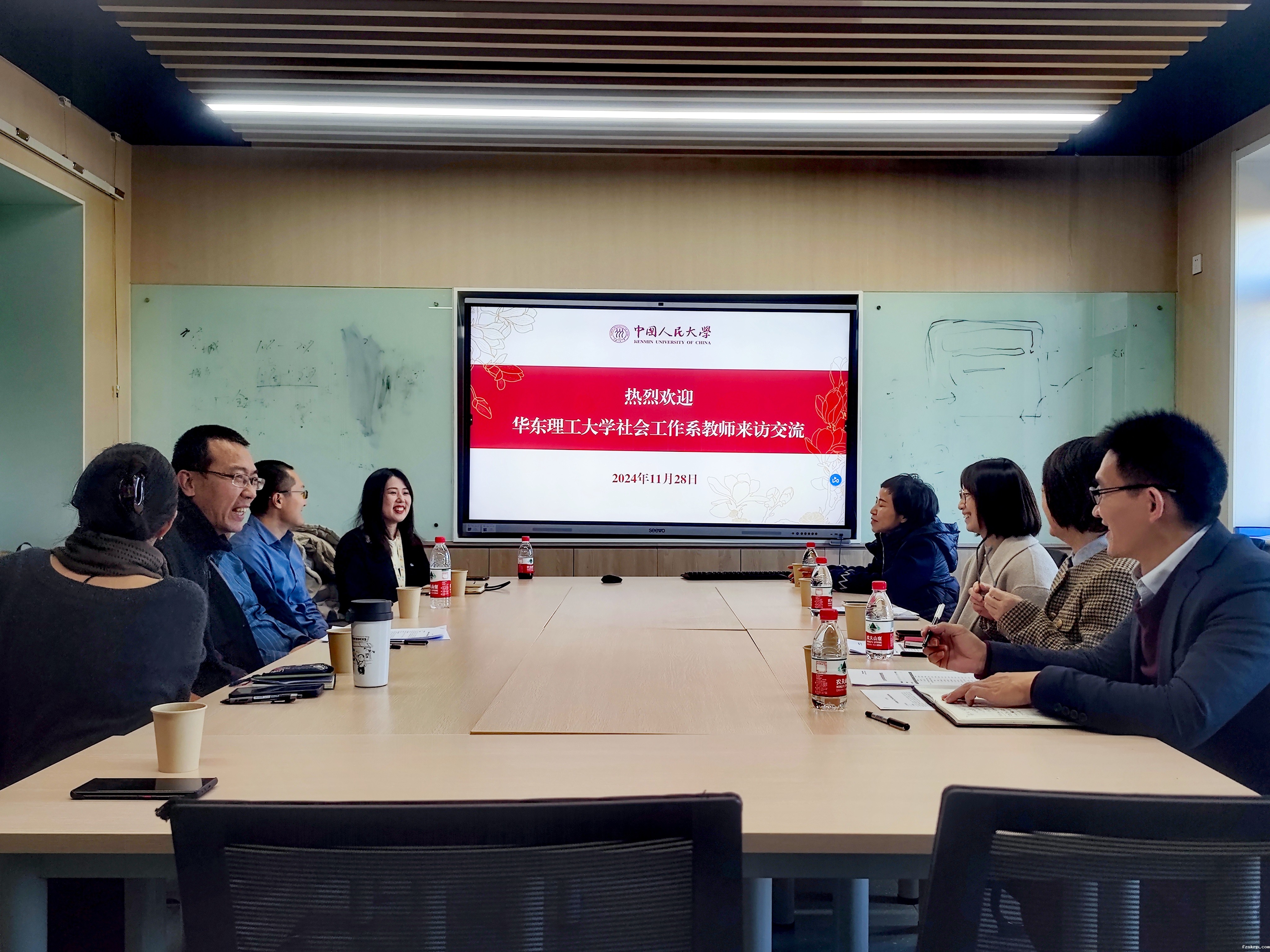 为进一步加强社会工作一流专业建设,助推社会工作更好地服务国家经济社会和基层治理现代化目标,2024年11月28日下午,伟德下载官网安装app社会工作系系主任朱眉华教授、副系主任徐选国副教授、青年教师焦克媛博士一行3人赴中国人民大学社会学院社会工作系进行专业建设、学科发展、教育教学经验交流。中国人民大学社会工作系系主任卫小将教授、副系主任吕楠副教授、党支部书记赵晰博士、《社会建设》编辑部主任何欣副教授、MSW实习主任徐硕博士、本科实习主任王阳博士,正在中国人民大学开展访学的云南大学民族学与社会学学院刘建娥教授,以及3名博士研究生共同参与了此次经验交流会。